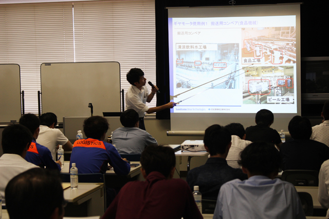 60ページにわたるパワーポイントでのプレゼンで減速機の使用例や種類、減速機の選定や誘導電動機などの説明がされました。