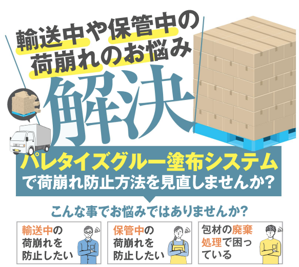 パレタイズグルーシステムは、水溶性接着剤塗布による荷崩れ防止方法のことです。