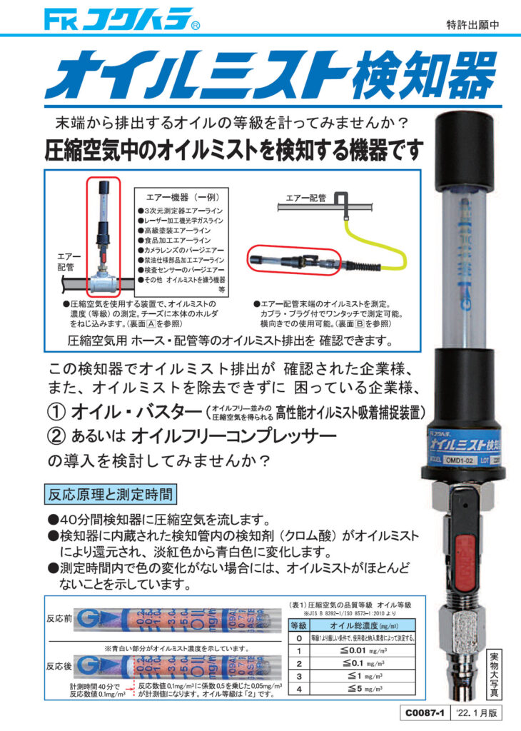 このオイルミスト検知器は、末端から排出される圧縮エアーのオイルの等級を計ることが出来ます。石川商事では、オイルミスト検知器の無償貸出を致します。