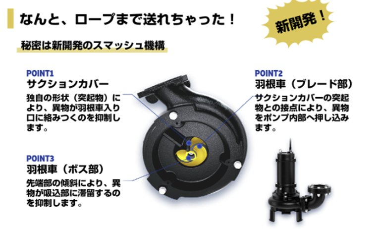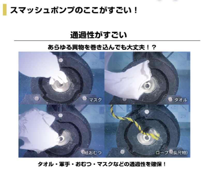いつも大変お世話になっております。石川商事株式会社です。今回は、鶴見製作所の異物通過性の高いポンプをご紹介します。ポンプの詰まりを大幅に低減させるため、ポンプの異物撤去など、メンテナンスにかかる作業負担を軽減し、設備の維持管理の省人化に繋がります。