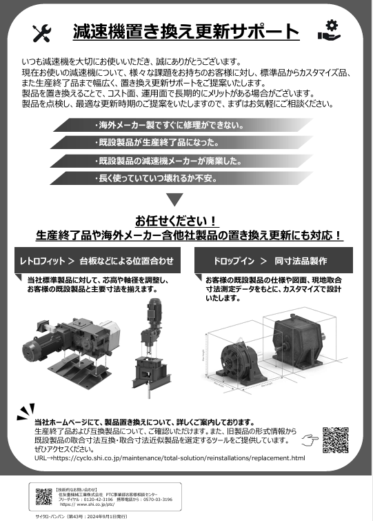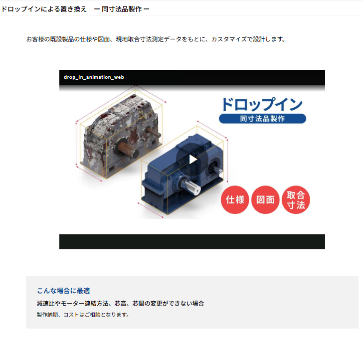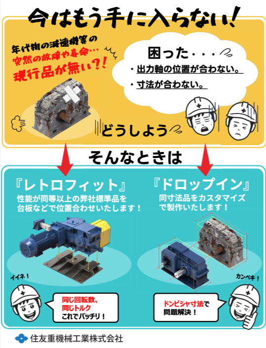 いつも大変お世話になっております。石川商事株式会社です。今回は、住友重機械の減速機のレトロフィット・ドロップインをご紹介いたします。年代物の減速機や海外製の減速機をお使いで、現行品が無いものをご使用ではありませんか?住友重機械工業では、性能が同等以上の標準品を台板などで位置合わせを行う「レトロフィット」同寸法品をカスタマイズで製作をする「ドロップイン」で現行品が無い減速機の置換え更新のサポートを行います。