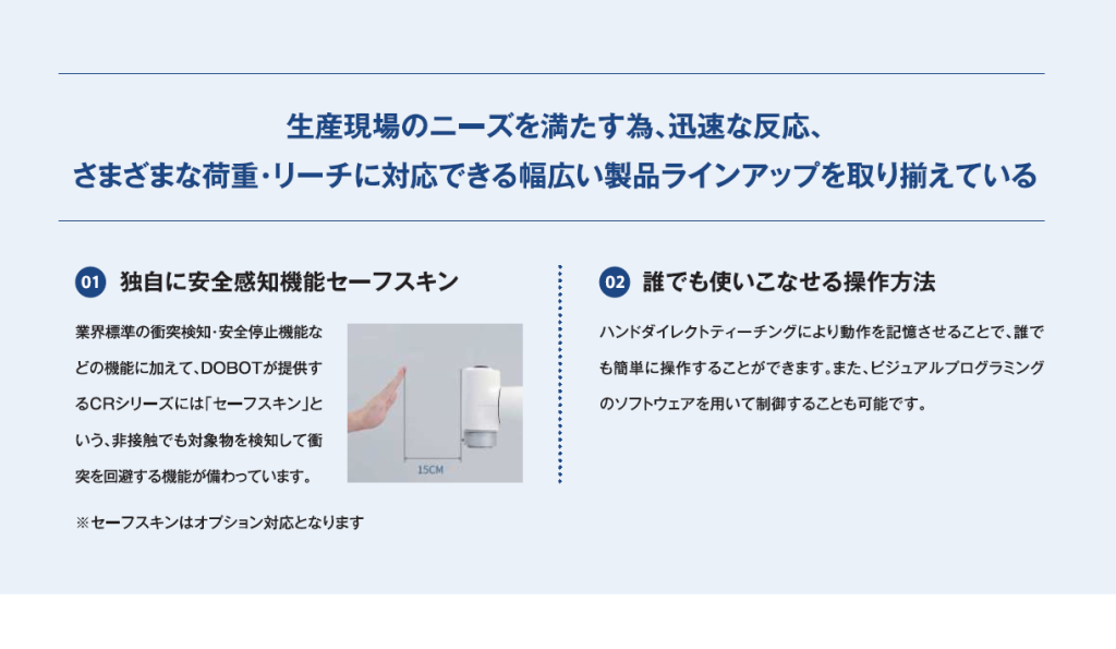 いつも大変お世話になっております。石川商事株式会社です。今回は、DOBOTの協働ロボットをご紹介します。協働ロボットを導入する事で、単純な作業や身体的負荷の高い作業を完全に自動化する事や、作業の中で人とロボットが、安全に効率良く協働で作業を行うこが出来るようになります。またDOBOTは、直感的な操作方法で未経験の方でも、容易にプログラミングする事が可能です。ロボットを幅広く活用できる人材を育成する事が出来ます。