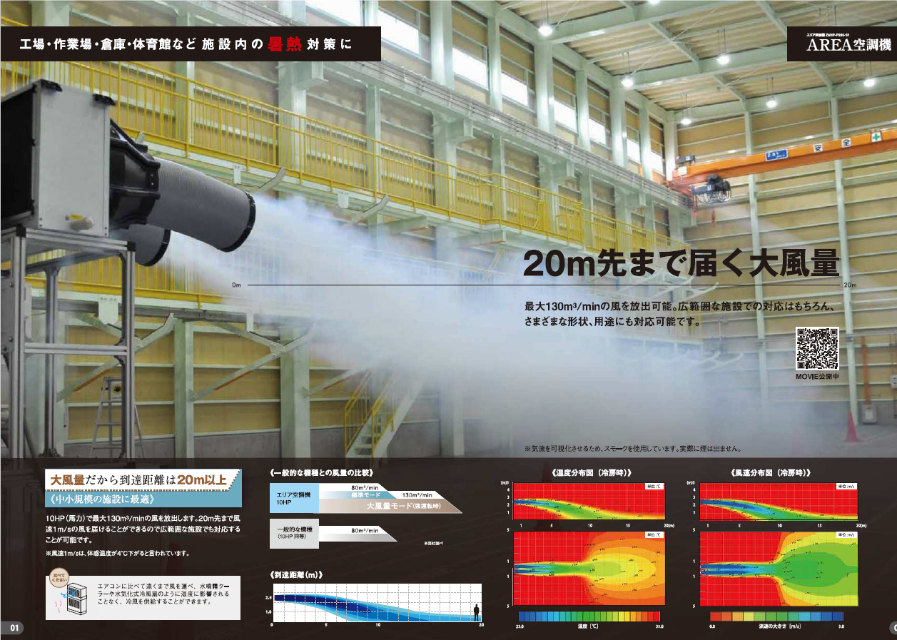 最大130m3/MINの風を放出します。20m先まで風速1m/Sの風を届けることができるので広範囲な施設でも対応することが可能です。