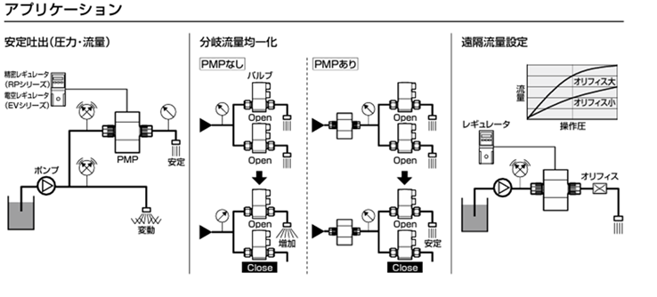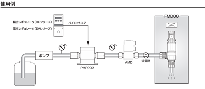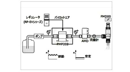 ダイヤフラムポンプからの脈動で流量測定が安定しない→PMPをつければ抑止可能(パイロットエアと精密レギュレータが必要です)