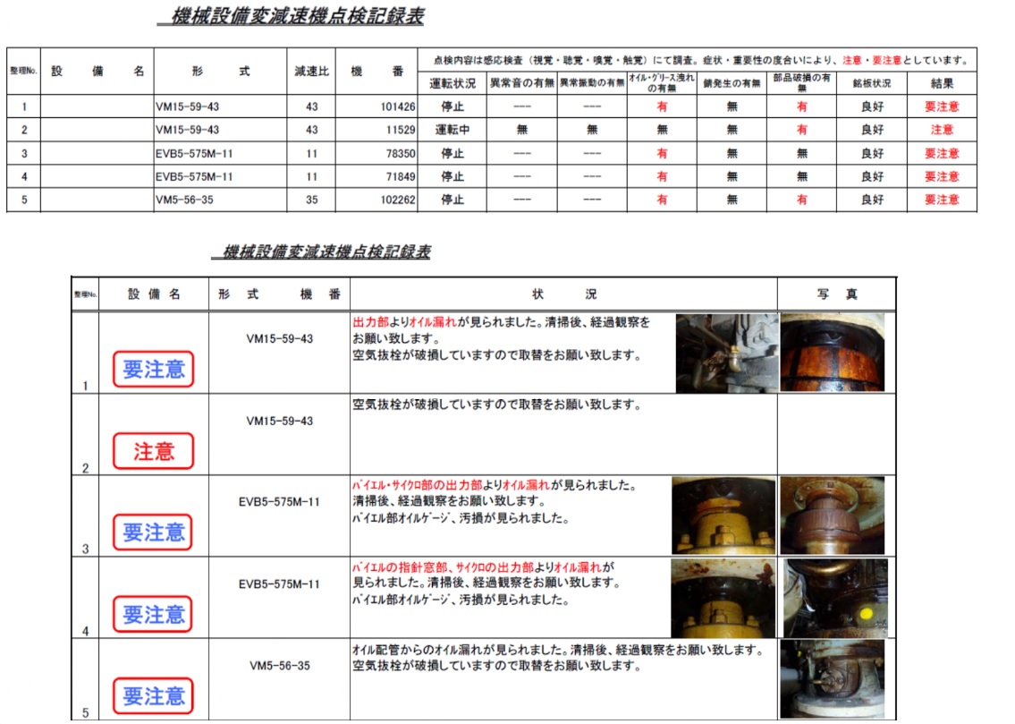 石川商事では、トラブルになる前の事前活動として、古い減速機の点検及び現状調査の活動を行っております。古くなった減速機は、生産中止や部品の供給が停止されているものも多く、経年劣化による故障から緊急停止などの思わぬトラブルが発生することがあります。客先にある減速機の不具合や旧品の調査の為に、減速機の異音や油漏れを確認して減速機のリストを作成致します。